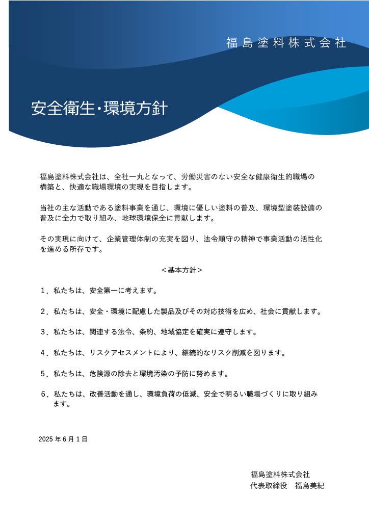 この度、<安全衛生・環境方針>について次のような方針を掲げました。職場の安全を最優先に考え、安心して働ける職場を目指します。また、環境に優しい商品、設備、工程をお取引先さまにご提案することで、持続可能な社会の実現に貢献いたします。